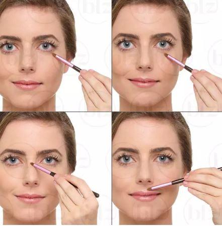 Pincel para aplicação de corretivo. Deposita o cosmético em pontos específicos do rosto a serem disfarçados, como espinhas, cicatrizes e manchas escuras, com acabamento perfeito.